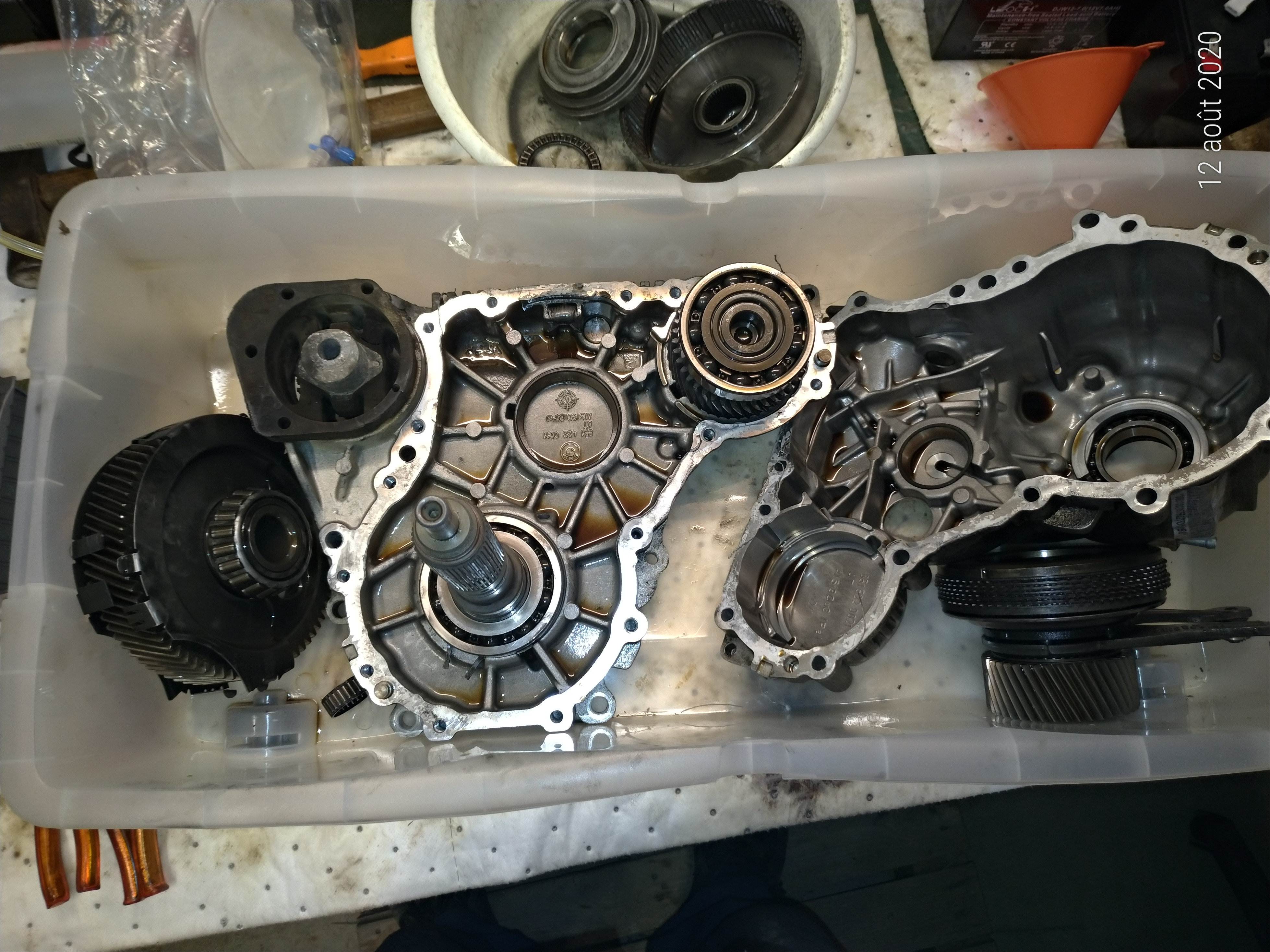 J'attends la colle, le remonte la boite de transfert et j'en profite que la voiture soit sur cales pour vidanger les ponts et la boite de vitesse, résultat dans 8j temps de séchage de la colle!