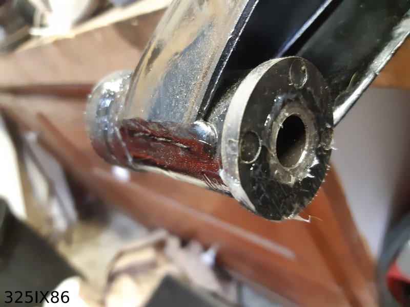 Puis il faut presser le tube métallique depuis l'intérieur vers l'extérieur. Si il ne rentre pas à la main, un étau un peu costaud suffira à l'insérer. Puis, une fois les silentblocs et le tube métallique en place sur les deux bras du triangle il "suffit" de remonter le triangle sur la traverse.